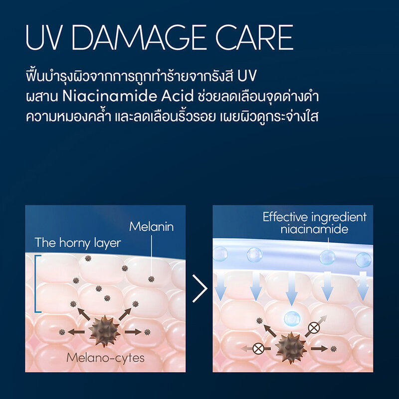 Night serum with a soft and smooth texture, absorbs quickly, not sticky, combines Green Tea Extract and Niacinamide to reduce wrinkles, dark spots, and dullness caused by UV rays, along with Glutamic Acid, Aloe Vera Extract, Lavender Oil, and Ashitaba Leaf Extract to help restore dry skin, maintain skin moisture, and strengthen the skin's protective barrier, revealing smooth, beautiful skin that looks radiant and healthy.