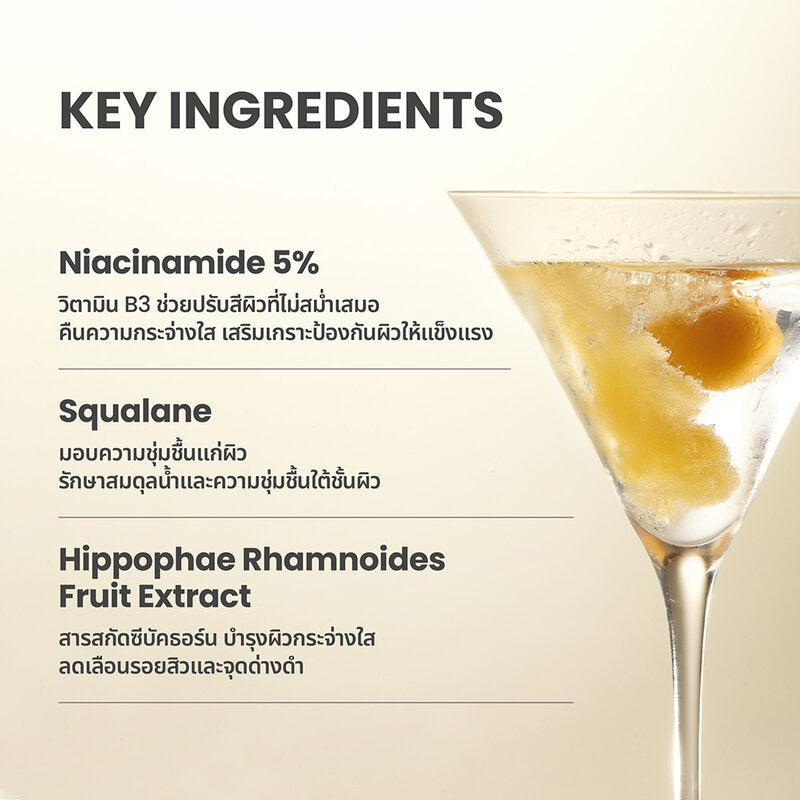 Glow facial serum for bright and clear skin, evens out skin tone with Niacinamide 5%. Dark spots appear to fade along with Squalane, extracted from plants, allowing the serum to retain moisture. Glowing skin looks healthy. Tone up skin with special ingredients Niacinamide and Rice Bran, increasing confidence from the inside out. Helps soothe and reduce redness of skin with acne problems, as well as soothing uneven and sensitive skin.