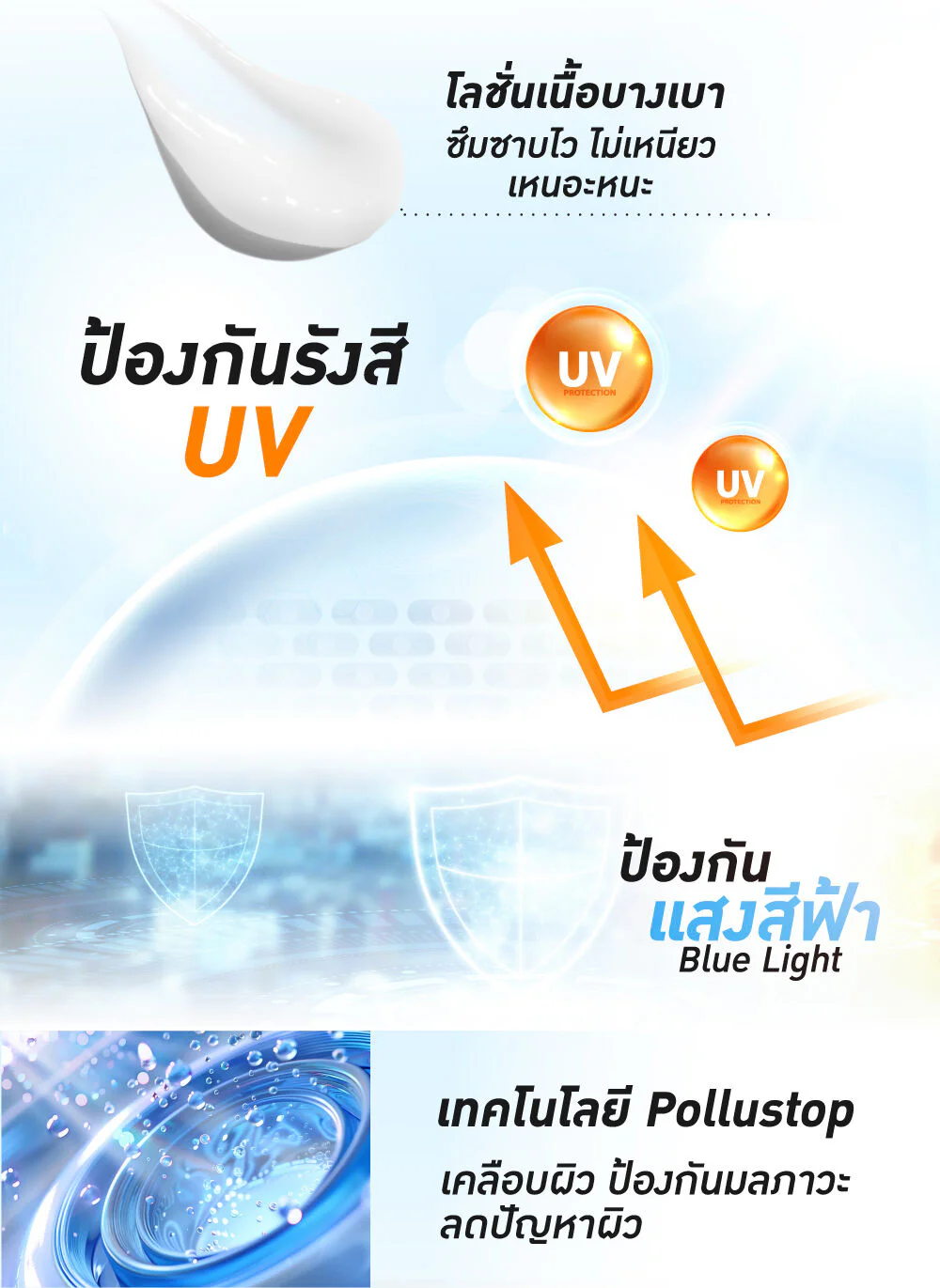 Body lotion with a light texture, absorbs quickly, and is not sticky. With Pollustop innovation, it acts like a film coating the skin, helping to protect the skin from external pollution, which is the cause of skin problems. Protects the skin from UV rays and blue light. Nourishes the skin to be soft and moisturized, preventing dryness with extracts from pears (Pear Fruit) and shea butter (Shea Butter), rich in essential fatty acids, vitamins A and E. It is a moisturizer that helps increase moisture for radiant, smooth, clear skin, and provides a refreshing, relaxing scent all day long.