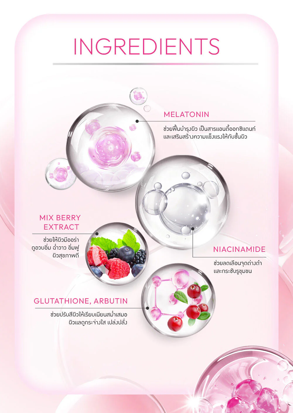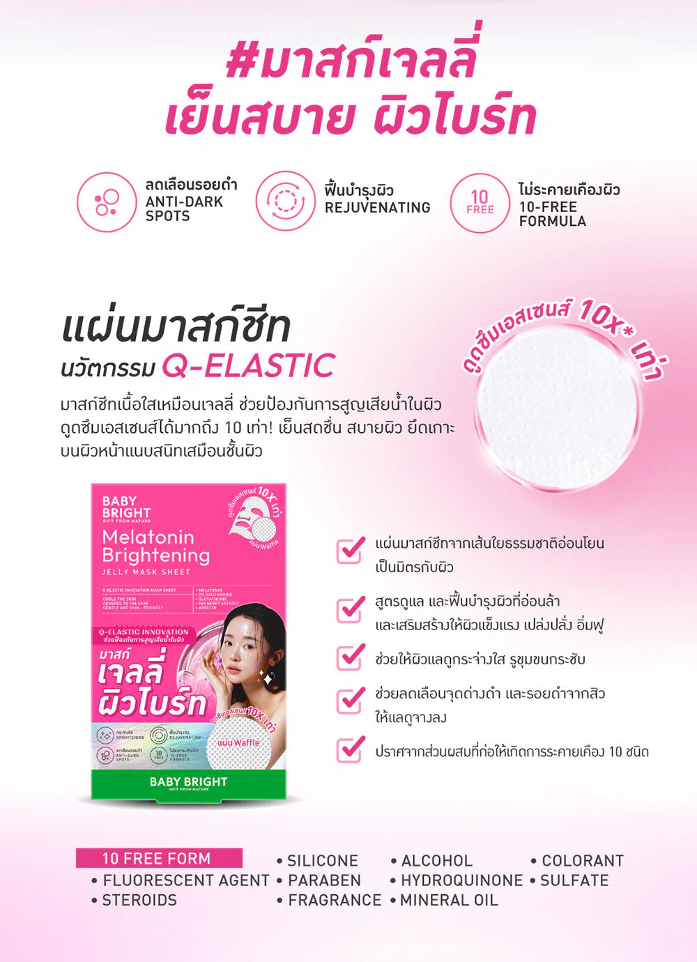 Innovative Q-Elastic mask sheet, a clear jelly-like mask helps prevent water loss from the skin, absorbs essence well, is cool and refreshing, and comfortable on the skin. It adheres to the skin like a layer of skin. The mask sheet is made of natural fibers, gentle and skin-friendly. It directly restores the skin to be radiant, plump and healthy with Melatonin, which helps restore tired skin and strengthens the skin. Combined with the benefits of 2 Niacinamides, it helps brighten the skin and tighten pores. And Mix Berry Extract helps reduce dark spots and acne scars to fade and helps delay premature aging. It also contains Glutathione and Arbutin to help restore dull skin to be radiant, even skin tone, giving the skin a radiant, radiant and naturally healthy look.