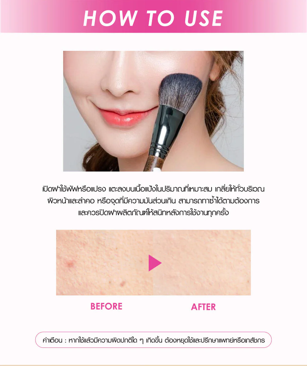 Fine, fine pressed powder protects against UVA and UVB rays with SPF40 PA+++. Provides a smooth, light texture that doesn't feel heavy on the face. Helps control oiliness, is water-resistant, and sweat-resistant. Controls skin pigmentation, revealing a bright complexion. The face doesn't drop, the powder doesn't come off, and there are no stains during the day.
