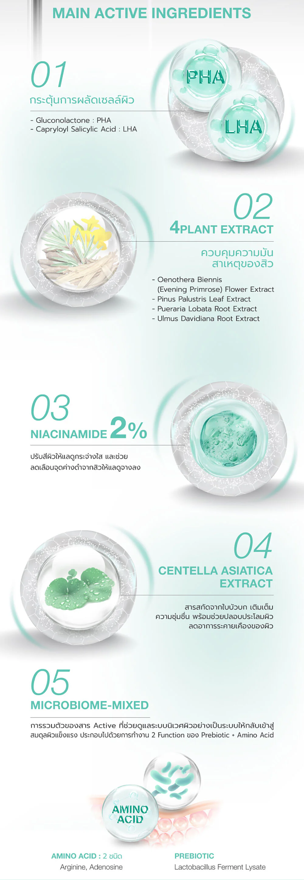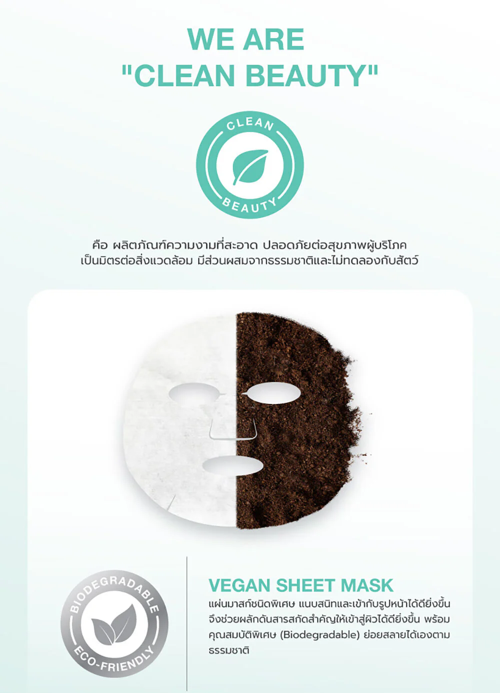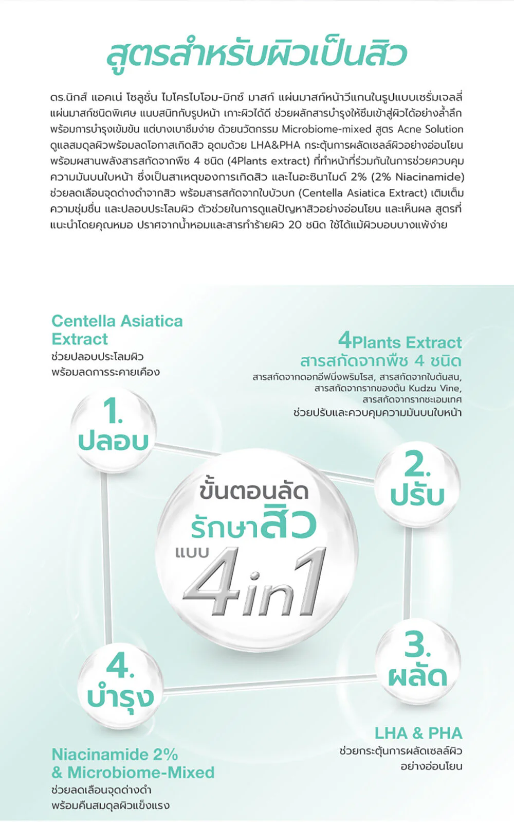 Vegan Acne Solution Facial Mask Sheet comes in a lightweight, easily absorbed jelly serum form with Microbiome-Mixed innovation to help balance the skin and reduce the chance of acne. Enriched with LHA & PHA and 4 types of plant extracts, it helps gently exfoliate the skin and control oil on the face. It also combines 2 % Niacinamide and Centella Asiatica extract to help reduce dark spots from acne and soothe the skin to be moisturized, giving you smooth, beautiful, healthy skin.