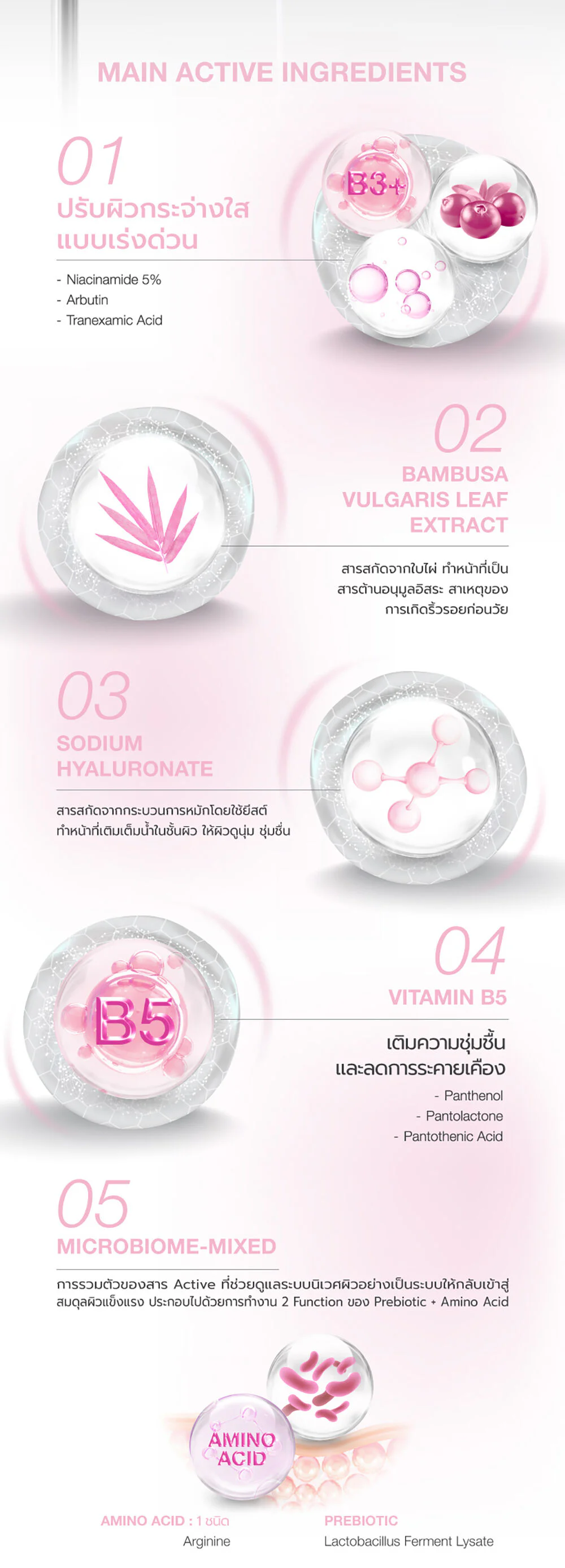 Vegan facial mask sheet, White Booster formula, comes in a lightweight, easily absorbed jelly serum form with Microbiome-Mixed innovation to help care for skin balance and address dull skin problems. Enriched with 5 Niacinamide, Arbutin, and Tranexamic Acid, it helps brighten skin and combines Sodium Hyaluronate, derived from a natural yeast fermentation process, to help replenish moisture to the skin, leaving it smooth, bright, and with a healthy aura.