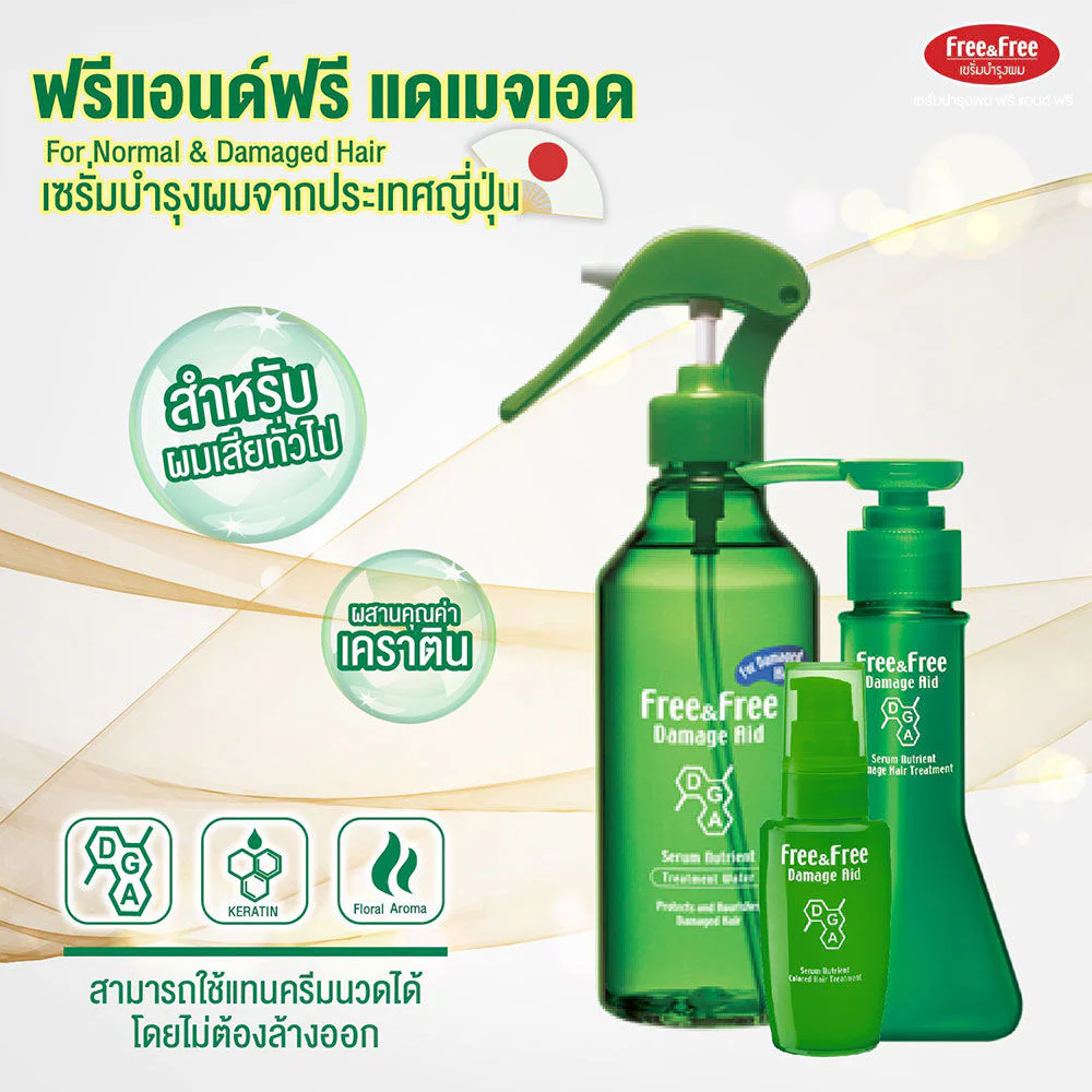 Hair care gel serum formulated for general damaged hair with DGA serum, a natural plant extract exclusive to Free & Free, Japan. It has the ability to repair damaged hair down to the hair shaft, helping to condition hair from the inside out, making hair strong, healthy, moisturized, and weighty, and easy to style. It does not make hair sticky, flat, or clumpy after use.