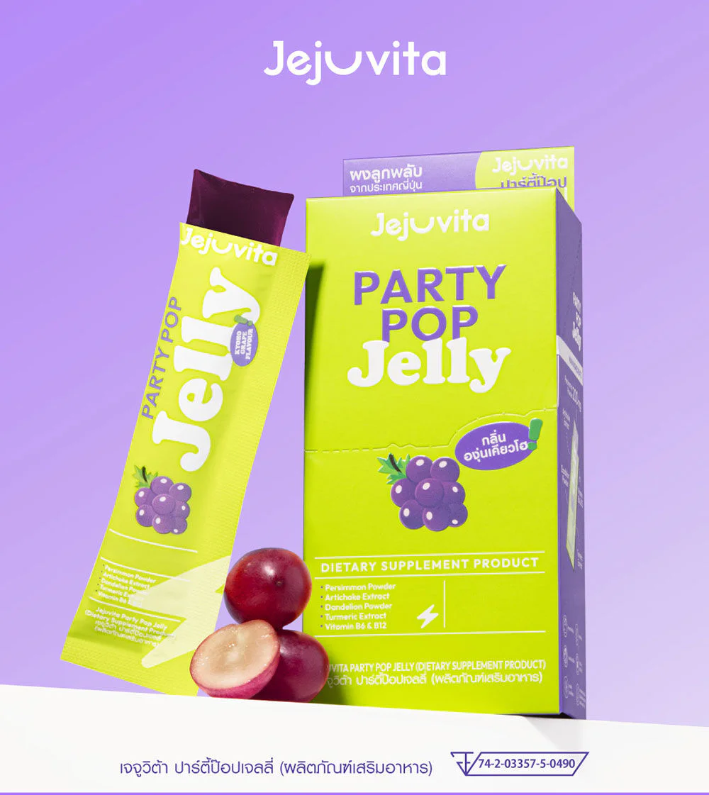 Party Pop Jelly dietary supplement, Kyoho Grape flavor, fragrant, delicious, chewy, fun to chew. Contains natural extracts including ginger, artichoke, green tea, and turmeric, along with dandelion powder, peppermint powder, konjac powder, grape powder, and persimmon powder. It is also combined with L-Glutathione, inositol, vitamin B6, and vitamin B12.