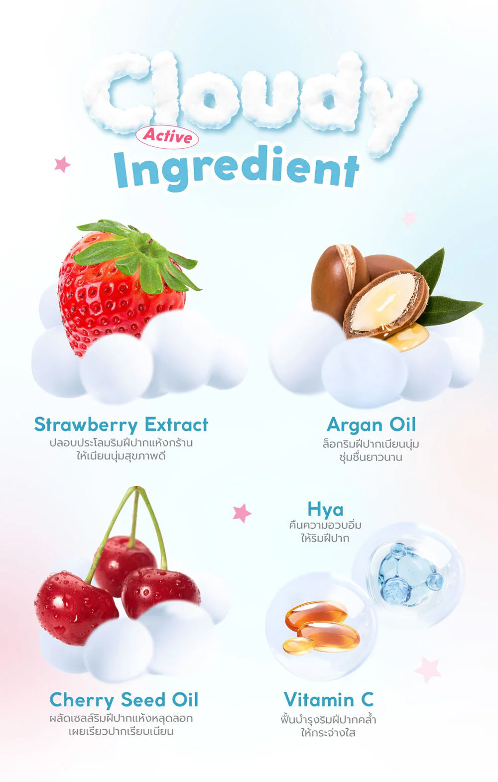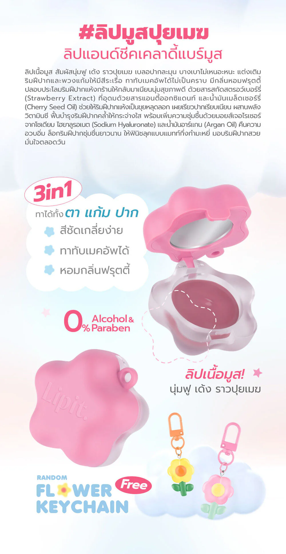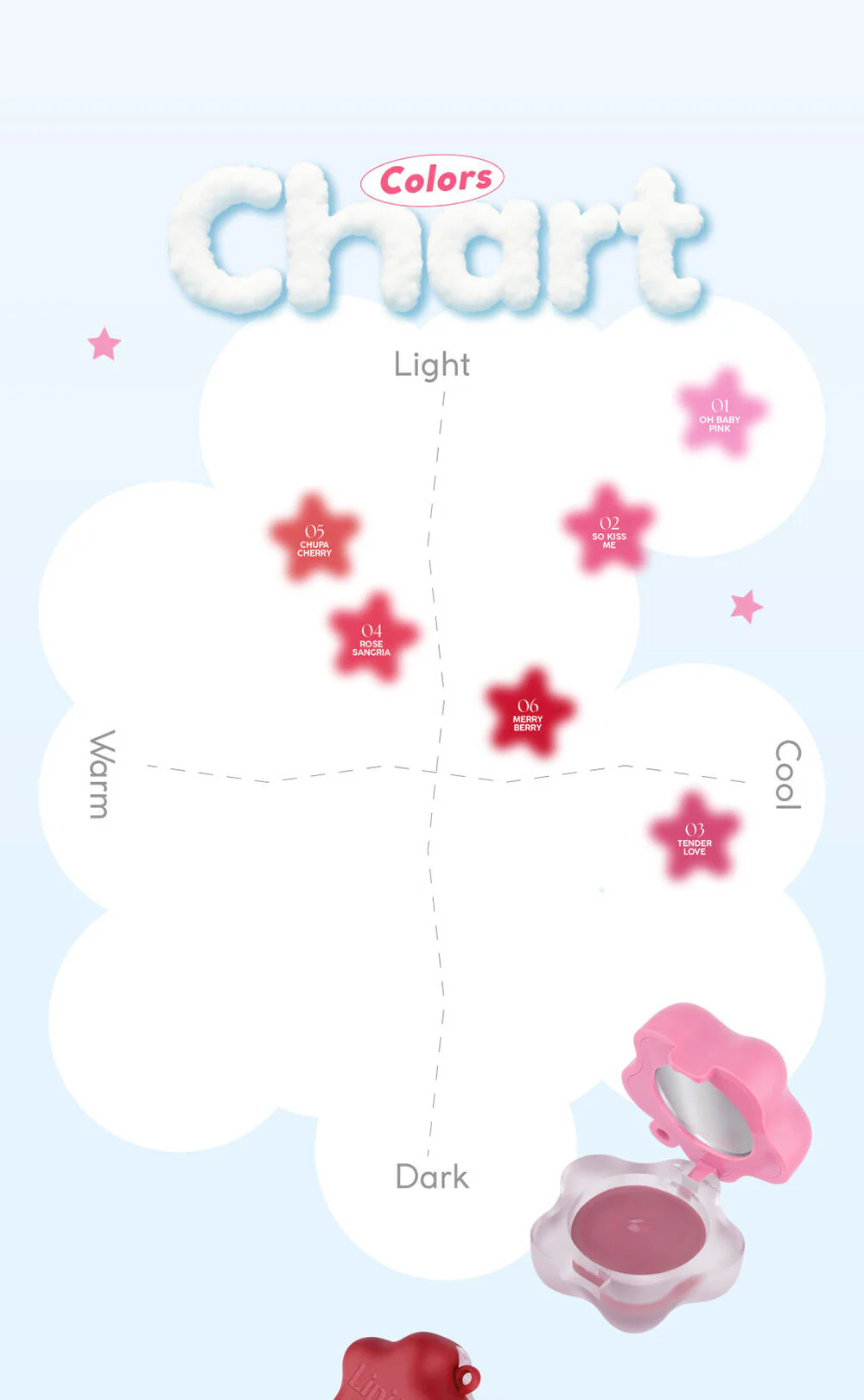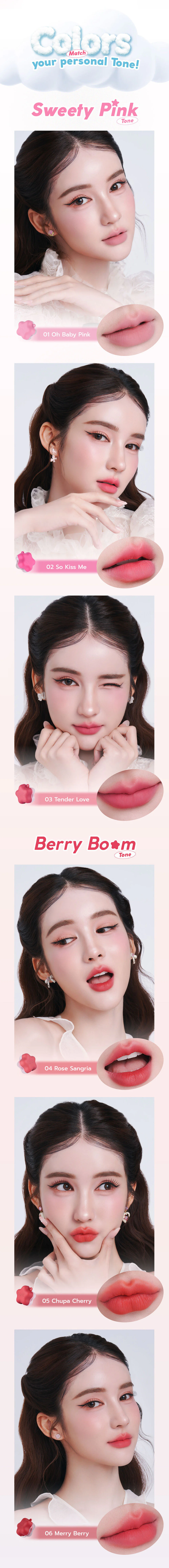A lightweight mousse lip color that feels soft and fluffy like a cloud. The pigments are clear, easy to spread, and non-staining. Formulated with Strawberry Extract, Cherry Seed Oil, and Vitamin C, it helps exfoliate dry, chapped lips to reveal smoother, more radiant lips. Sodium Hyaluronate and Argan Oil help lock in long-lasting moisture, delivering a semi-velvet matte finish for plump, beautiful lips that feel confident all day long.