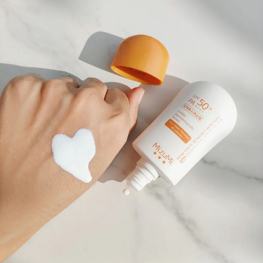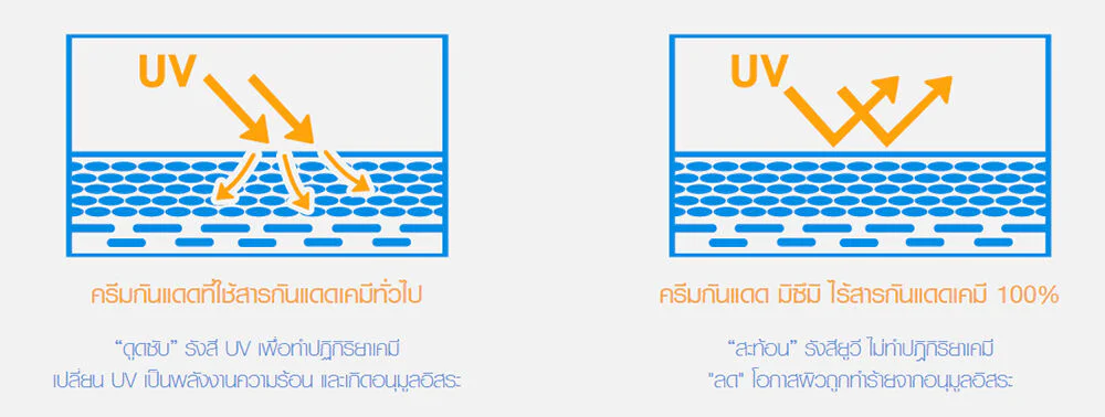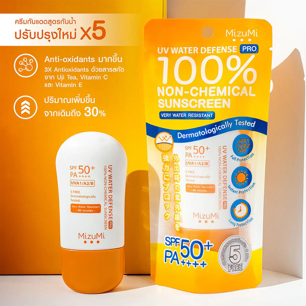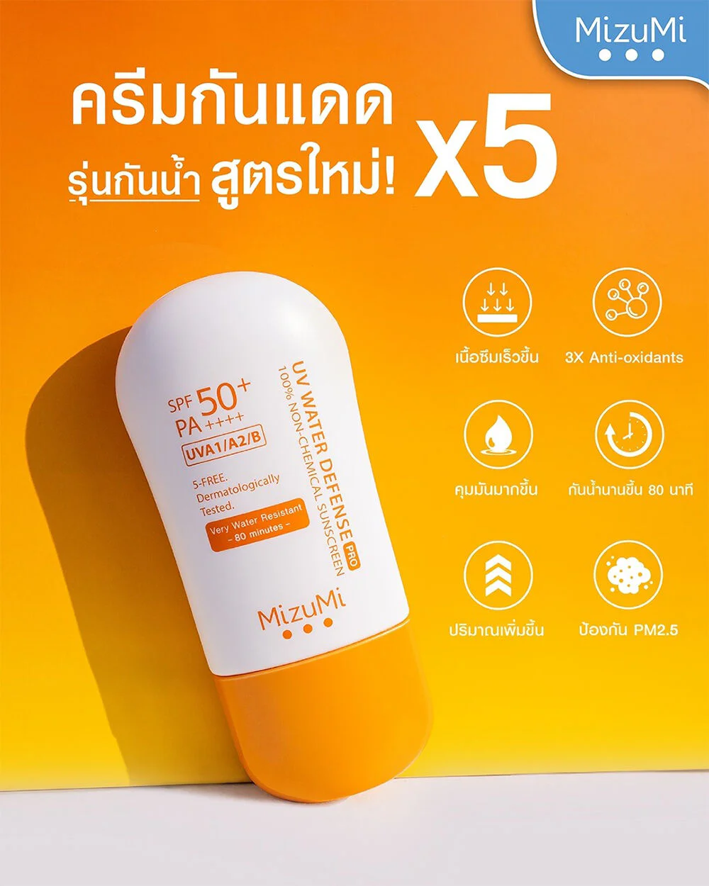 Cr. Facebook.com/mizumiofficial A new and improved X5 waterproof sunscreen formula, 100% free of chemical sunscreens% by using the principle of reflecting UVA1/UVA2/UVB rays, which are the cause of dullness and premature aging, away from the skin. Dry Touch texture, dries faster, does not leave a white cast when set, ready to go out in the sun without waiting with Very Water Resistant properties, waterproof up to 80 minutes and more antioxidants with 3X Antioxidants with Uji Tea extract, Vitamin C and Vitamin E and also provides better oil control, matte skin all day, makeup does not melt