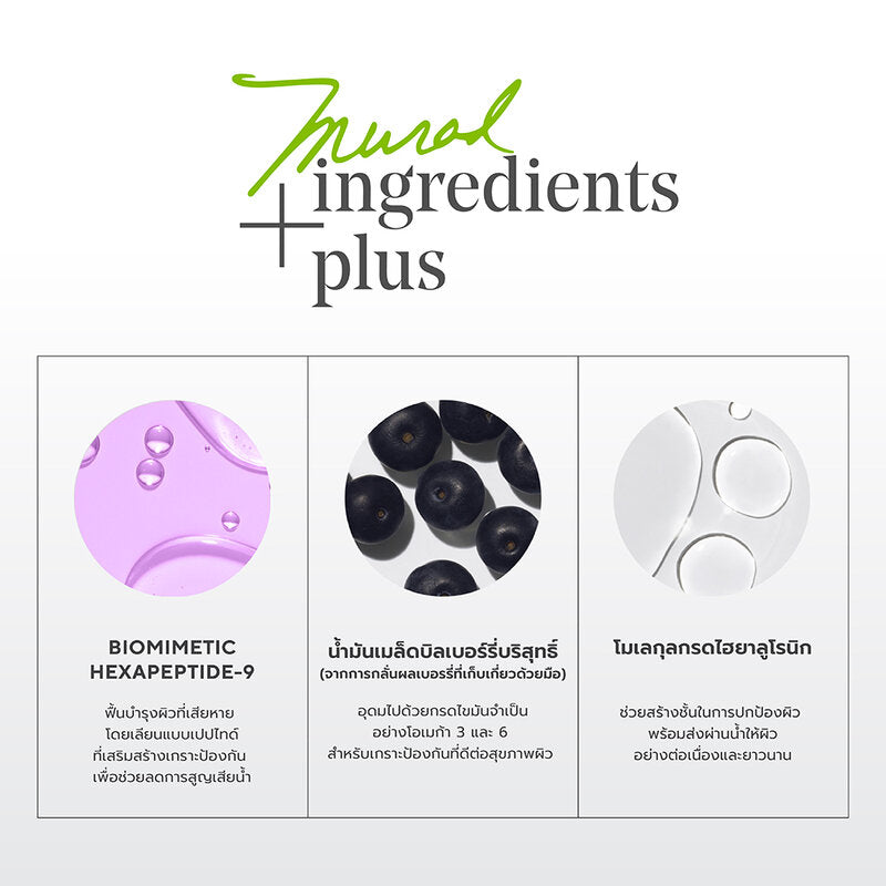 An advanced serum that revolutionizes skin recovery with the power of Hexapeptide-9. Restores the skin's protective barrier with the science of recovery that helps keep skin moisturized, plump, and healthy-looking. Ready to restore skin in 3 steps, helping to care for damaged, dry skin to become strong and healthy again with deep nourishment, replenishing 3 important elements that skin needs: ¥ Moisturizing: Deeply hydrates the skin, leaving it soft and supple, and preventing dryness. ¥ Essential Fatty Acids: Strengthen the skin's protective barrier with essential omegas, helping to retain moisture and protect the skin from the daily pollution. ¥ Peptides: Helps enhance the skin's natural renewal process, strengthening it, reducing the appearance of wrinkles and damage, and promoting a more radiant complexion. Key extracts ¥ Biomimetic Hexapeptide-9: An innovative peptide that mimics the function of important substances in the skin, strengthens the skin's protective barrier, reduces water loss in the skin, and restores skin damaged by external factors, helping the skin to be strong and healthy. ¥ Refined bilberry seed oil (from handpicked berries): Rich in essential fatty acids Omegas 3 and 6, skin looks plump and elastic to replenish essential nutrients. ¥ Network of hyaluronic molecules: is a linkage of hyaluronic acid molecules (Hyaluronic Acid) designed to create a light film that helps lock in moisture, continuously replenishes water to the skin, helping the skin to look plump and firm.