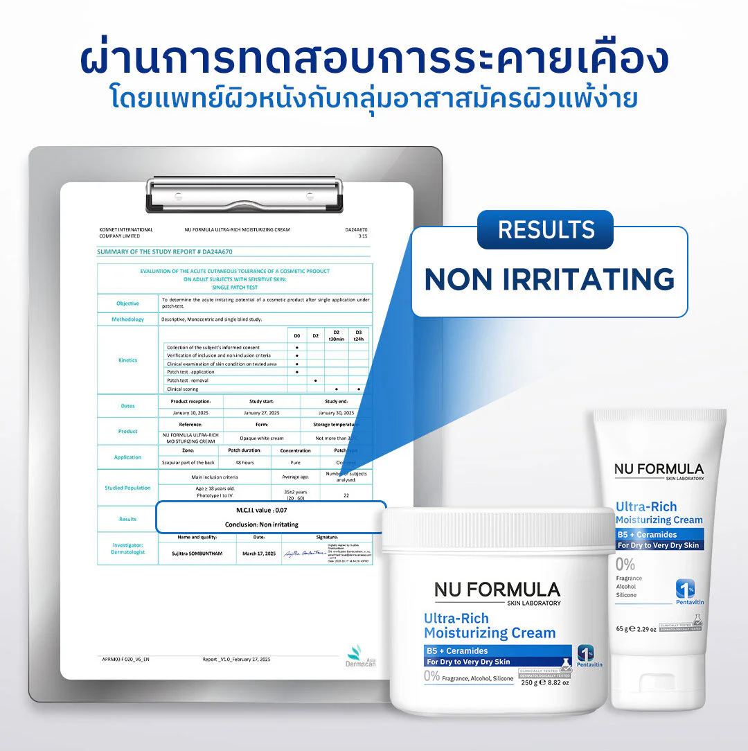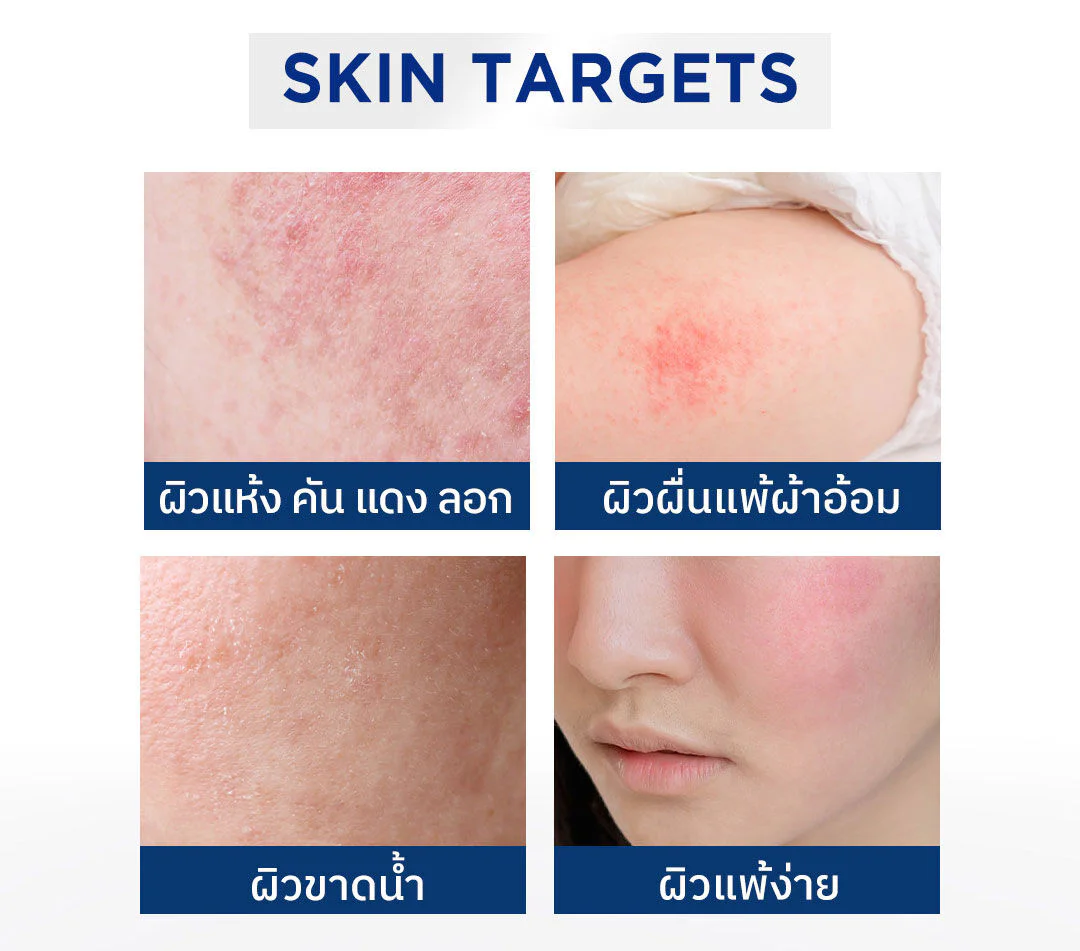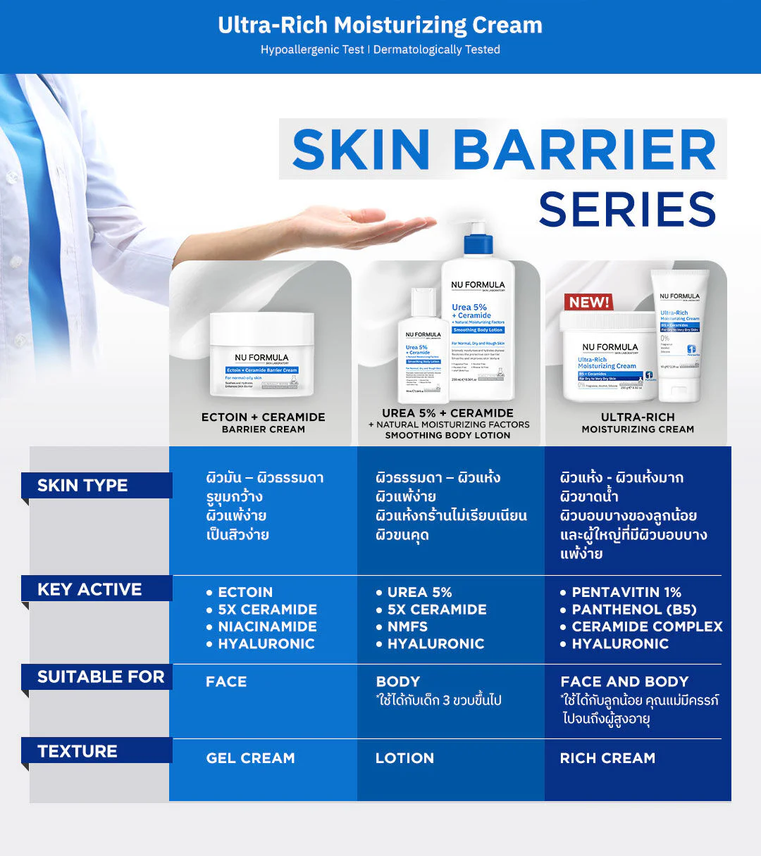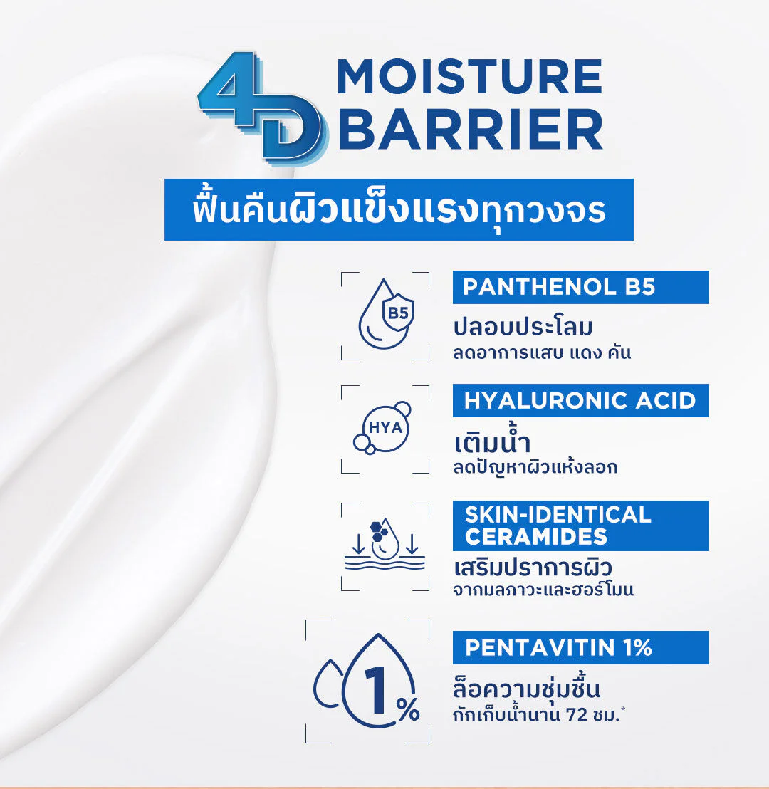 Facial and body care products formulated for dry skin and skin prone to irritation. Rich cream texture, absorbs quickly, not sticky. Helps deeply nourish the skin with 4D Skin Barrier combined with Panthenol, Hyaluronic Acid and Pentavitin 1% to soothe the skin and lock in moisture for a long time. With Ceramide Complex to help strengthen the skin's barrier, giving you smooth, soft, touchable, healthy-looking skin.