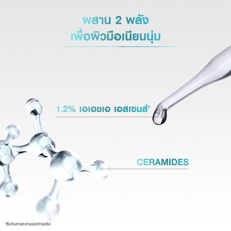 Hand lotion, formula to restore rough, dry, wrinkled skin, natural herbal scent, soft, smooth satin texture, absorbs quickly, not sticky, with Moisture Magnet technology to help retain moisture for a long time, combined with AHA Essence 1.2% and Ceramide to help restore rough, dry, wrinkled hand skin, revealing smooth, soft, moist, touchable hands.
