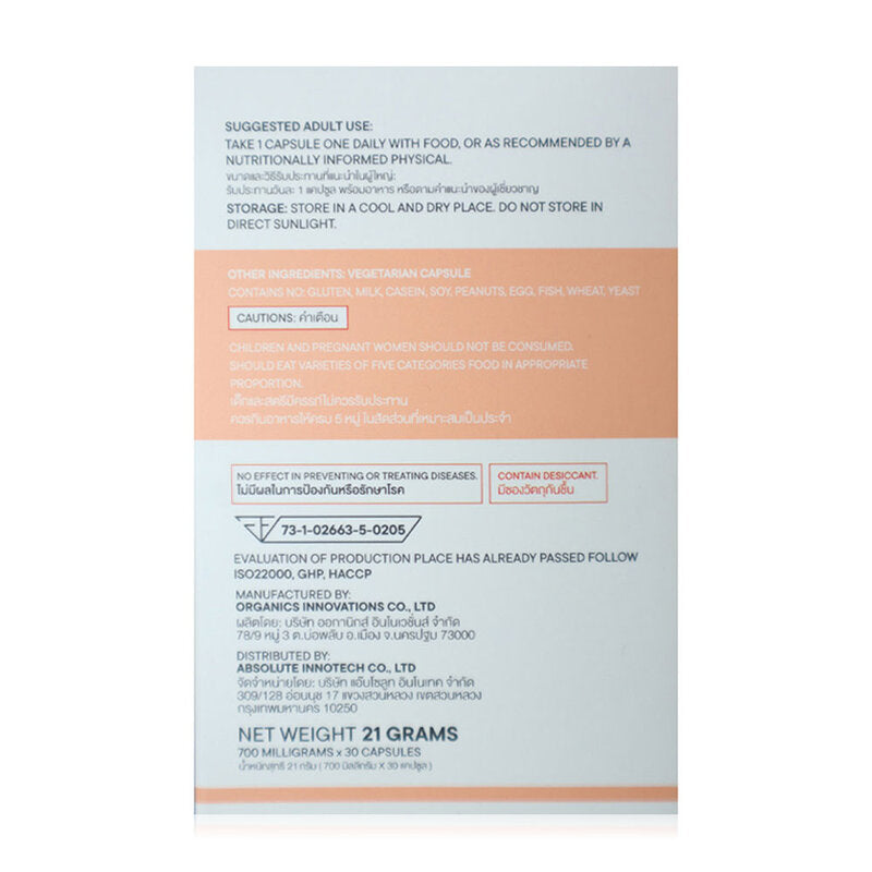 - Vitamin A, B1, B2, B5, B6, B7, B9, B12, C, E, D3, K2
